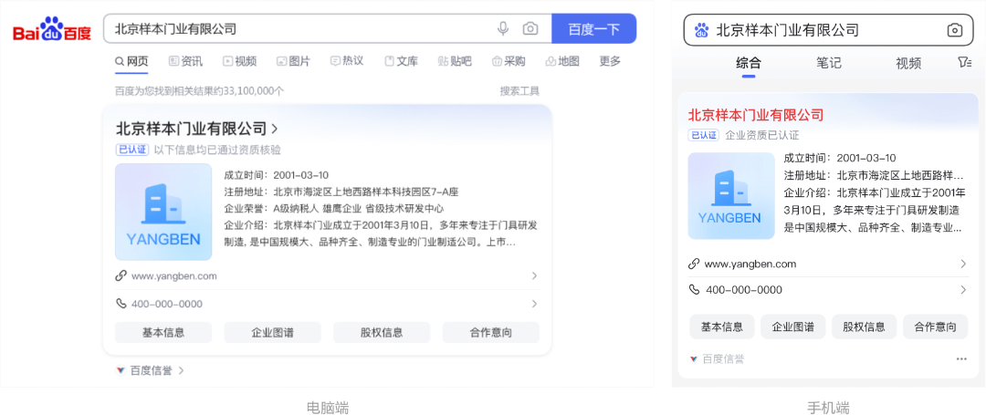 可在百度搜索结果中展示企业logo、企业标签、官网、电话、地址等基本信息