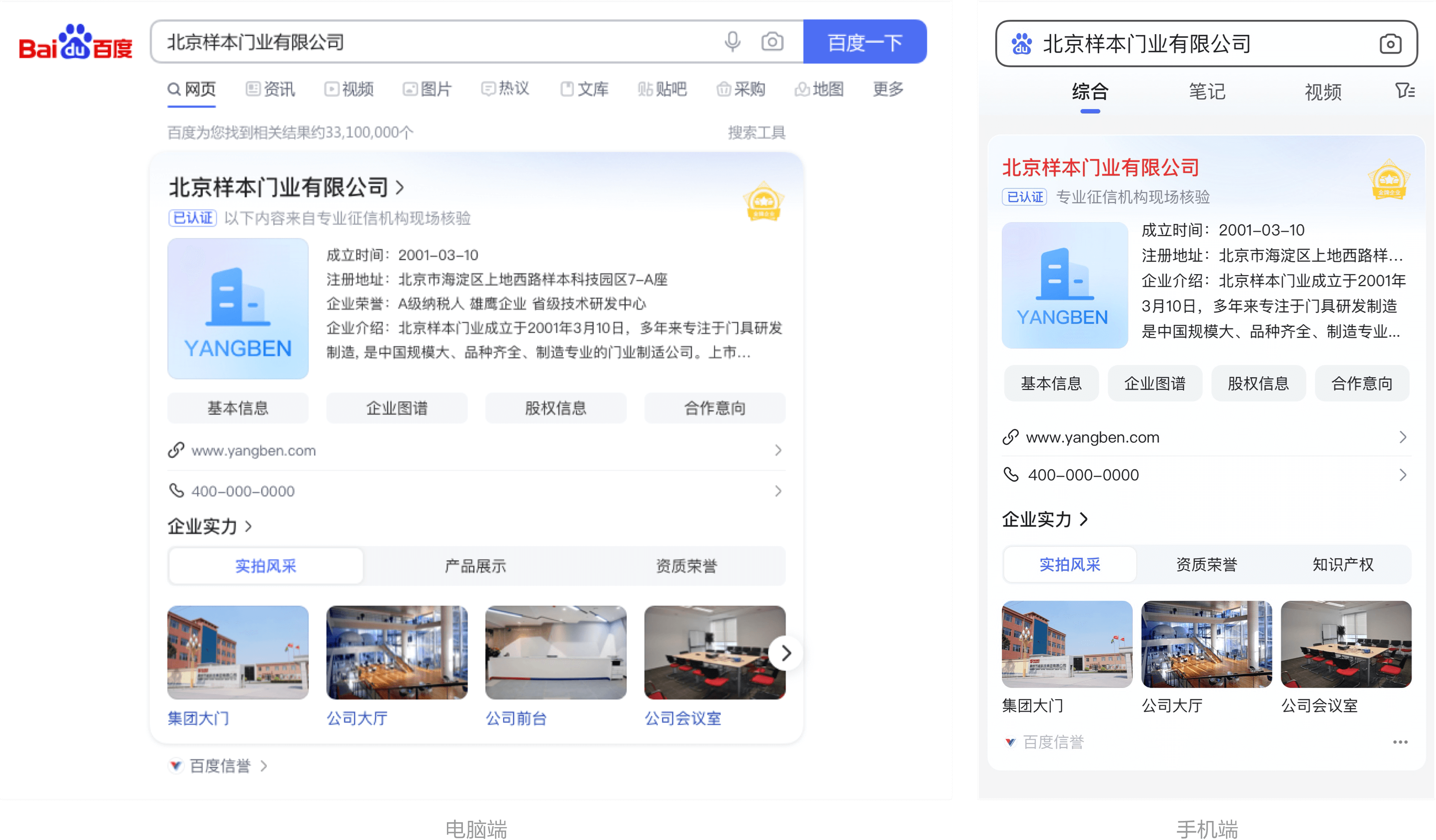 企业名片版以大面积定制化名片方式提供信息汇聚呈现,在企业名片中级版的基础上增加了众多特权展示。产品在百度搜索自然结果前3名黄金位置,实力商户尊享,多维信息定制化卡片,独有视频展示,手机、电脑双端齐发,将精准客户一网打尽!